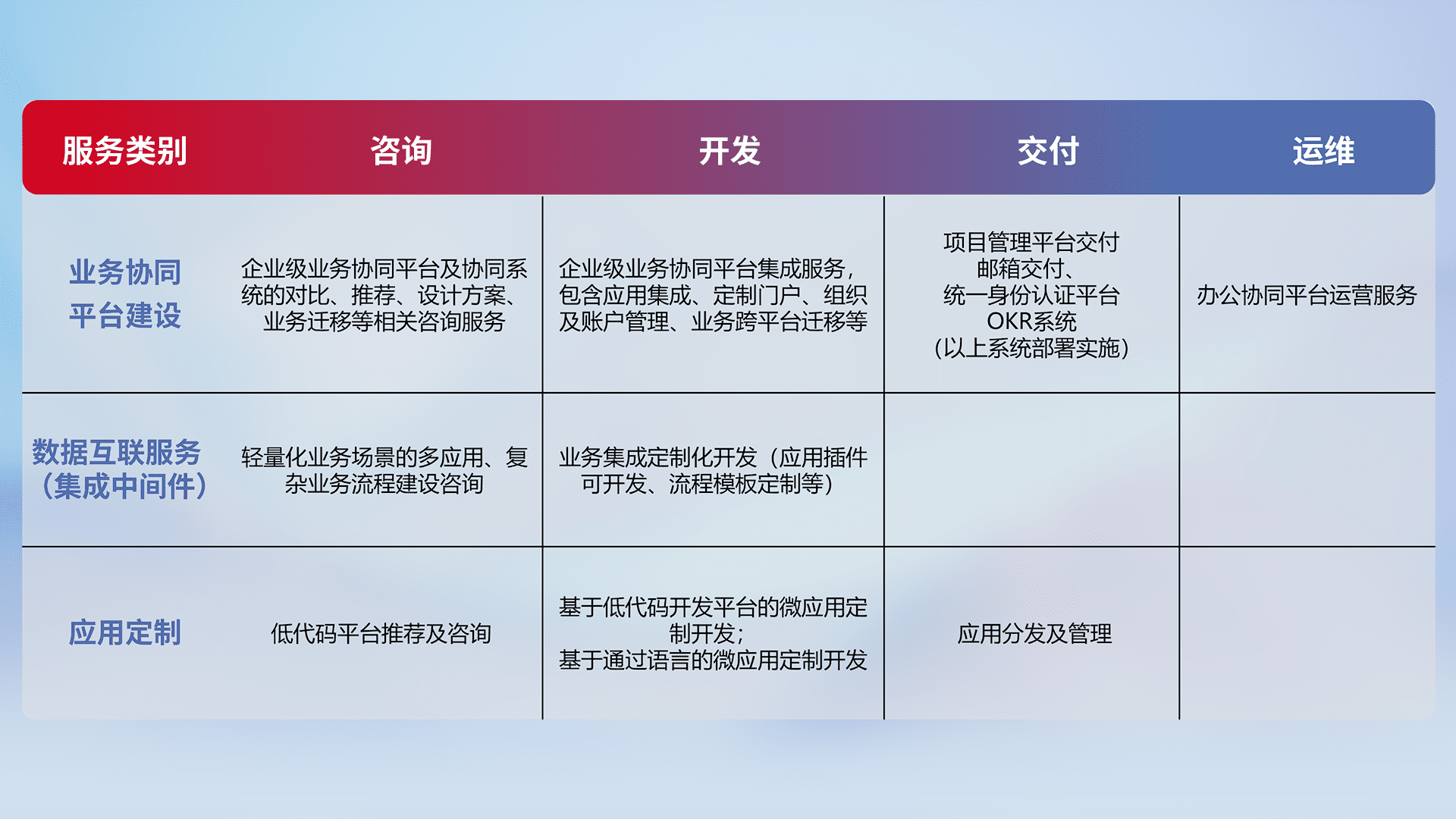 针对钉钉、、、、企微、、、IDaas等平台级产品提供产品的规划、、、、方案、、、交付、、、、定制化开发等服务,,实现如统一协同办公、、、智能客户服务、、混合会议管理、、、、智能数据查询、、、、等业务场景,,,实现数字化转型。。。